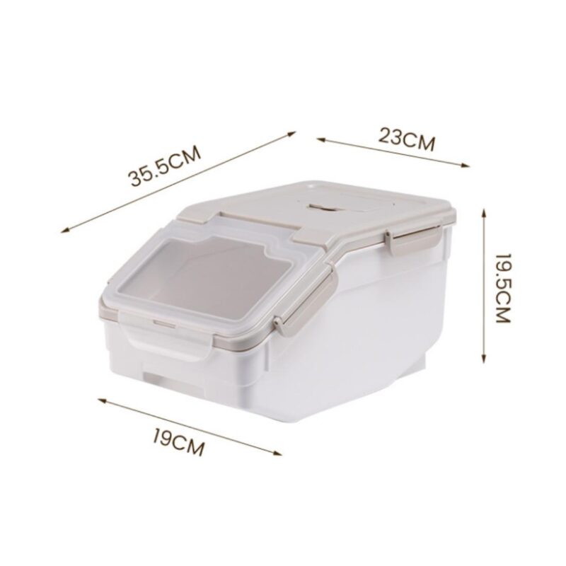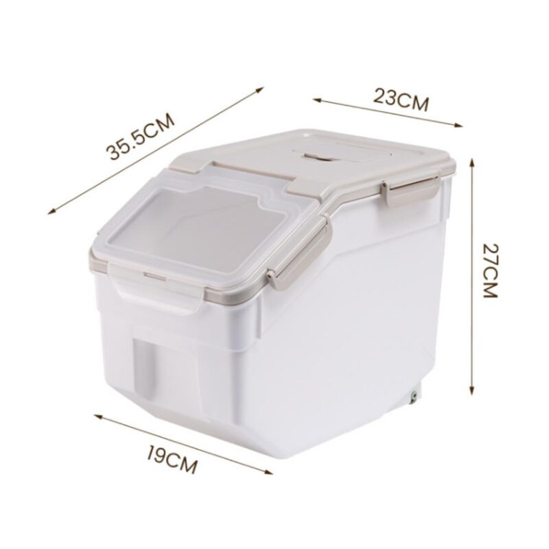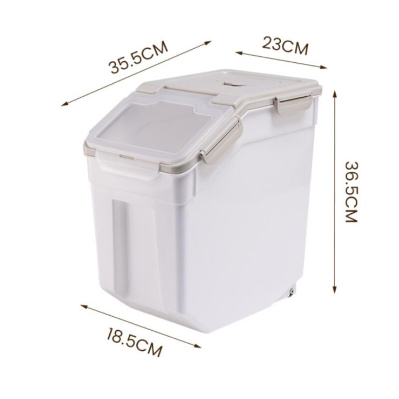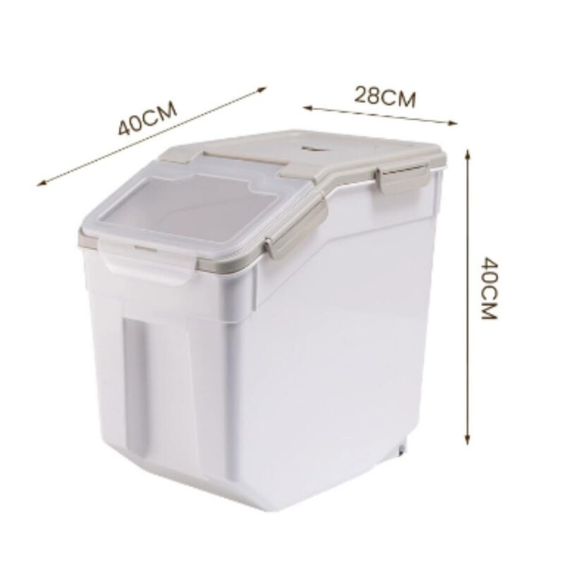 Εξαιρετικά ανθεκτικό και μεγάλο δοχείο αποθήκευσης, 100% αεροστεγές, διατηρήστε τα τρόφιμα σας αλλά και τη ξηρά τροφή των κατοικιδίων σας φρέσκα και προστατευμένα με το αεροστεγές διπλό σφράγισμα σιλικόνης. Είναι ιδανικό για να κρατά έξω την υγρασία και τα έντομα, κατασκευασμένο απο υλικό PP, μη τοξικό, καθαρίζεται εύκολα. Το διαφανές καπάκι σας επιτρέπει να ελέγχετε άμεσα την υπολειπόμενη ποσότητα ξηράς τροφής και διαθέτει αποσπώμενα ροδάκια για εύκολη μετακίνηση. Ένα δοχείο πολλαπλών χρήσεων καθώς μπορείτε να αποθηκεύσετε ξηρά τροφή κατοικιδίων, ξηρούς καρπούς, όσπρια, δημητριακά, αλεύρι αλλά και παιχνίδια, είδη γραφείου. Διαθέτει ποτηράκι μεζούρα.Επίσης μπορείτε να αποθηκεύσετε τα μπουκάλια καρυκευμάτων σας στην επίπεδη του κορυφή και να τα στοιβάζετε κάθετα για εξοικονόμηση χώρου.