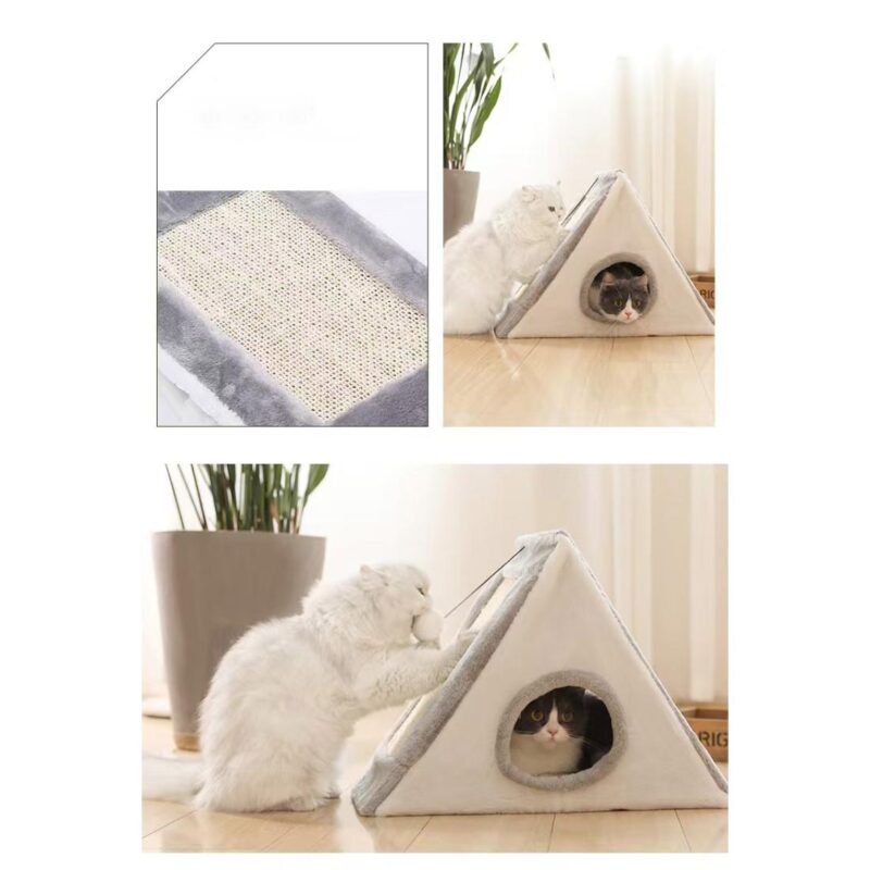 Η σταθερή κατασκευή του τριγωνικού σχήματος εγγυάται ότι η γατούλα σας θα μπορεί να ξύνεται και να παίζει με ασφαλή τρόπο. Κατασκευασμένο από υλικά υψηλής ποιότητας για ανθεκτικότητα και σταθερότητα. Με ποικιλία στοιχείων για ξύσιμο και παιχνίδι, η γάτα σας θα περνάει τον χρόνο της ενεργά διατηρώντας μια υγιή φυσική κατάσταση. Διαθέτει μια μπάλα pom pom για παιχνίδι καθώς και μια κρυψώνα-κρησφύγετο.